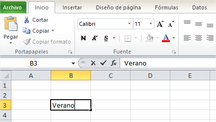 Lo primero que debes saber es que cualquier información que escribas en una celda de Excel hay que aceptarla. Si te colocas en la celda B3 y escribes “Verano”, verás un cursor parpadeando. Mientras ese cursor parpadee significa que aún no has aceptado la información, Excel está esperando y además notarás que el programa “se apaga”, está todo desactivado.
