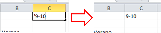 A veces ocurre que quieres escribir un literal, un texto y Excel piensa que se trata de información numérica. Por ejemplo imagina que quieres hacer un horario y necesitas escribir un cartel para la franja que va de las 9 a las 10 de la mañana así que se te ocurre escribir en la celda C1 “9-10”. Si escribes eso y das a Intro verás lo que ocurre. Excel cree que quieres poner una fecha y lo traduce (9‑oct), alineándolo además a la derecha como si fuera un número.