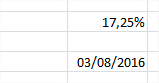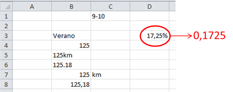 Colócate en la celda D3, escribe 17,25% y das a intro. Es cierto que te dije que no “adornaras” los números, pero el porcentaje no es un adorno, es un operador. Lo que sucede cuando acompañas un número del signo % es que Excel lo divide entre 100. Es decir, tú ves 17,25% pero el valor real de esa celda es 0,1725 y con ese valor operará Excel. Ya verás más adelante como hacer operaciones con los porcentajes. En estos momentos lo único que debes tener claro es que cuando veas escrito 7,5% realmente Excel almacena 0,075, es decir, 7,5 dividido entre 100.