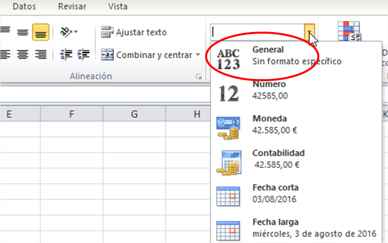 Esta sería la forma correcta de escribir una fecha en Excel aunque si prefieres que se vea de otra forma puedes cambiar el formato a posteriori. Te puedes colocar de nuevo en la celda D5 y elegir otro formato. Ya lo verás más adelante. Sin embargo ahora lo que tienes que saber es que detrás de esa fecha realmente se esconde un número. Haz la siguiente prueba. Colócate en la celda D5, despliegas la lista de formatos que hay en el grupo número y elige “General”: