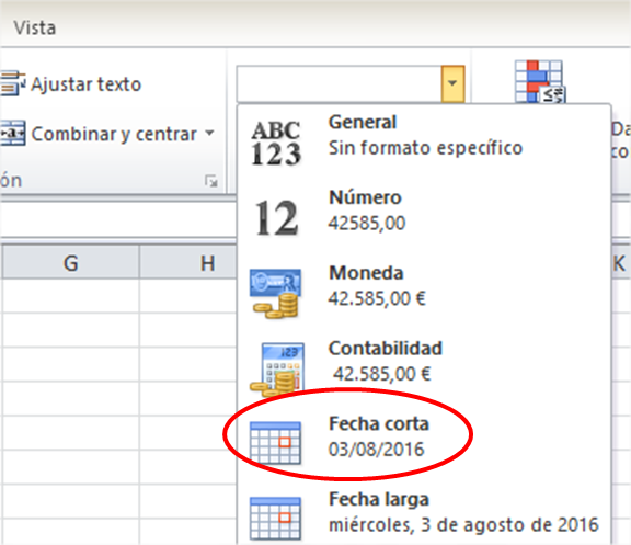 Si no te importa vuelve a colocarte en la celda D5 y da formato “Fecha corta” del desplegable: