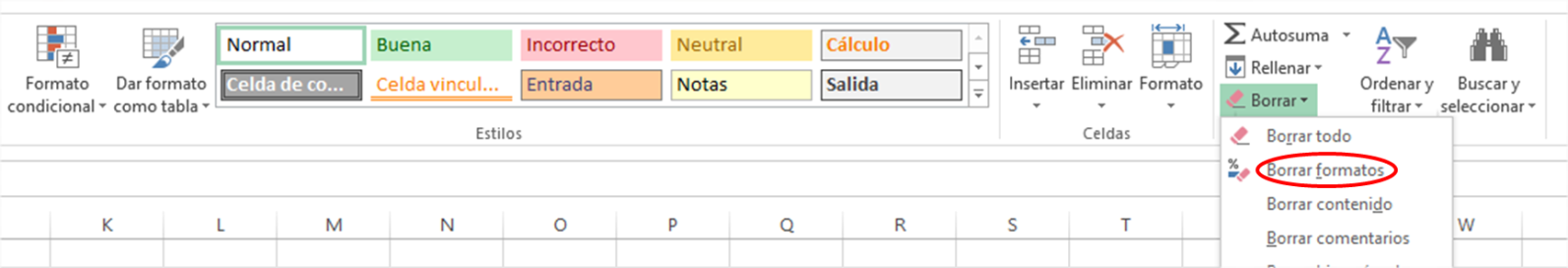 Pues bien, para limpiar una celda de contenido te bastará con usar la tecla “Supr” pero para borrar su formato tendrás que usar el botón “Borrar” del grupo “Modificar” en la ficha “Inicio”. Verás que ese botón es un desplegable desde donde podrás elegir varias opciones, entre otras “Borrar formato”, o incluso “Borrar todo” que incluye las 2 cosas.
