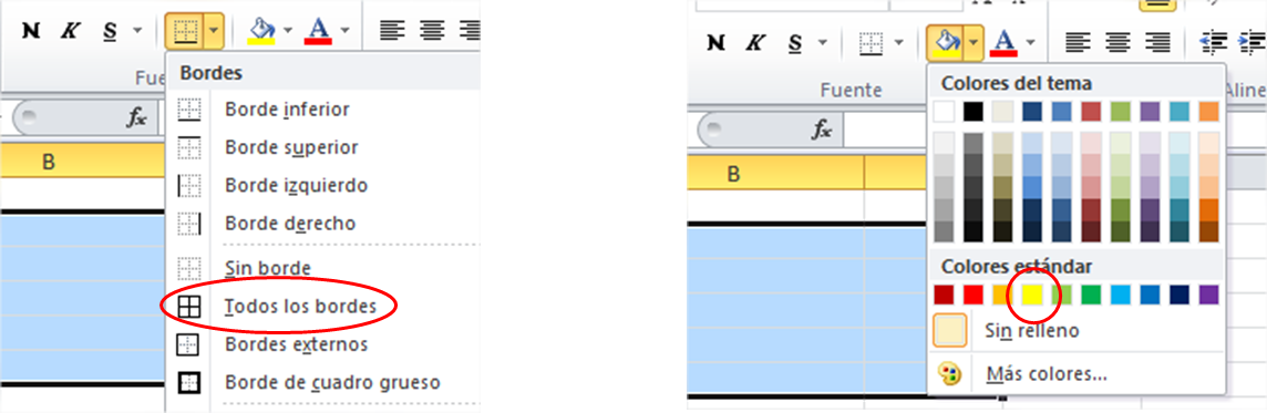Utiliza el comando de bordes y el de sombreados de la ficha Inicio para poner “Todos los bordes” y un relleno “Amarillo”: