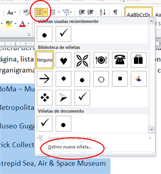 Lo segundo debe ser aplicar las viñetas. Para ello despliegas el botón “Viñetas” situado en el grupo “Párrafo” de la ficha “Inicio” y eliges la opción “Definir nueva viñeta”: