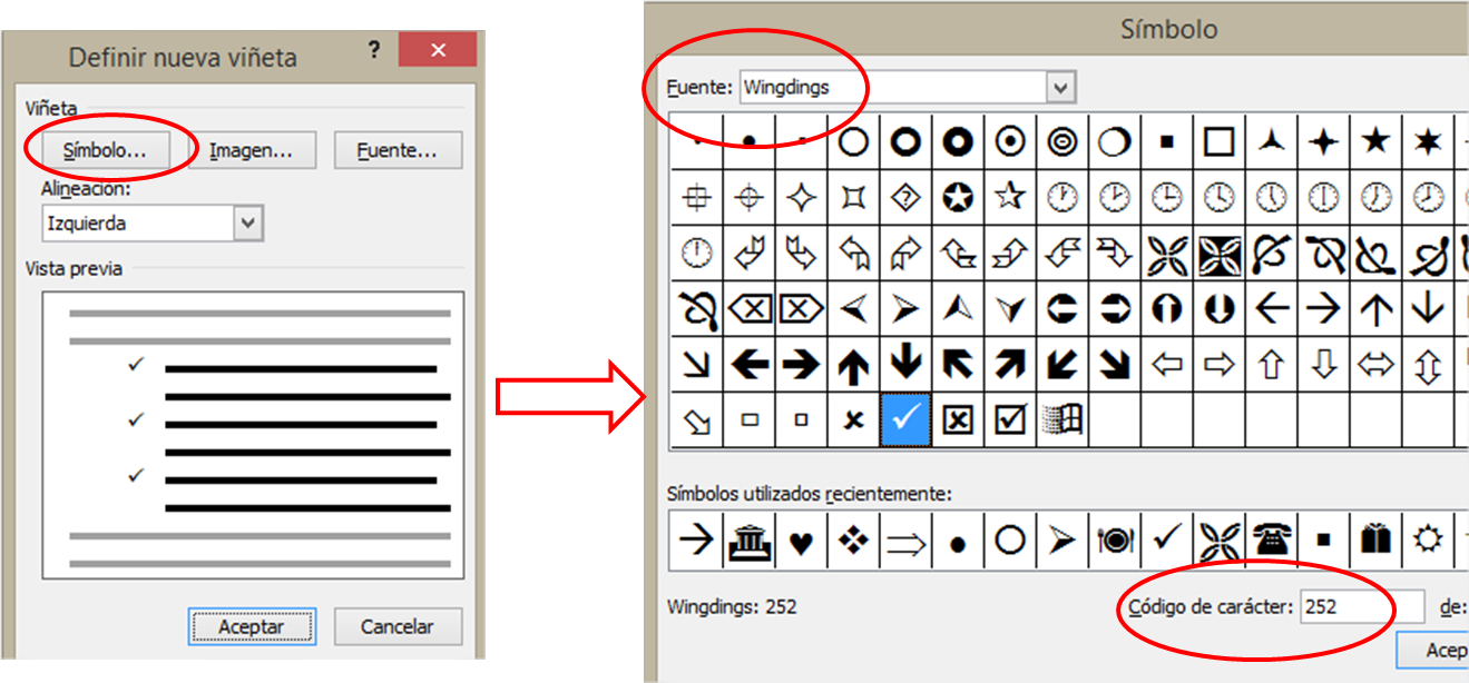 Ahí verás el botón “Símbolo”. Al hacer clic en él por fin llegas al cuadro donde poder localizar tu viñeta. Para ello deberás elegir la fuente de la viñeta que indiquen en el examen (en nuestro ejemplo Wingdings) y el código tecleando el número abajo y a la derecha del cuadro (en nuestro caso 252). Si en el examen no dan estos dos datos entonces será un rollo porque no te quedará otra que hacer una labor de búsqueda entre las diferentes fuentes que hay de viñetas (Symbol, Wingdings, Wingdings2, Wingdings3, Webdings).
