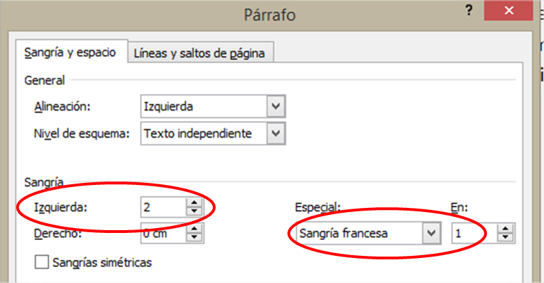 - Sangría Izquierda 2cm, sangría francesa 1cm