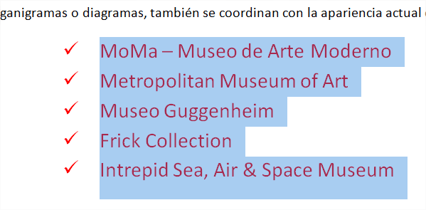 Ahora haz un clic en una de las viñetas (se marcarán todas) y pon otro color de fuente. Notarás que solo se aplica el cambio a las viñetas:
