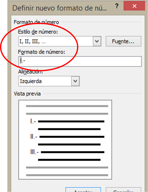 En el cuadro de diálogos que se muestra tienes que elegir números Romanos en el desplegable de “Estilos de número” y añadirle debajo cualquier “adorno” escrito por ti, en nuestro caso tendrás que acompañar al número romano con un punto y un guion. Esto lo escribes debajo en “Formato de número:”
