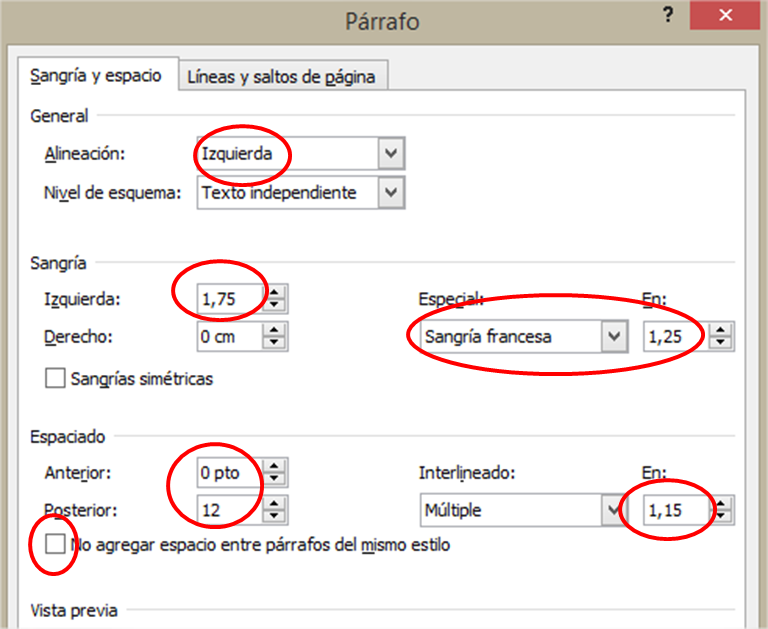 - Alineación Izquierda, Sangría izquierda 1,75cm, Sangría francesa 1,25cm, espaciado anterior 0pto, espaciado posterior 12pto, interlineado múltiple 1,15